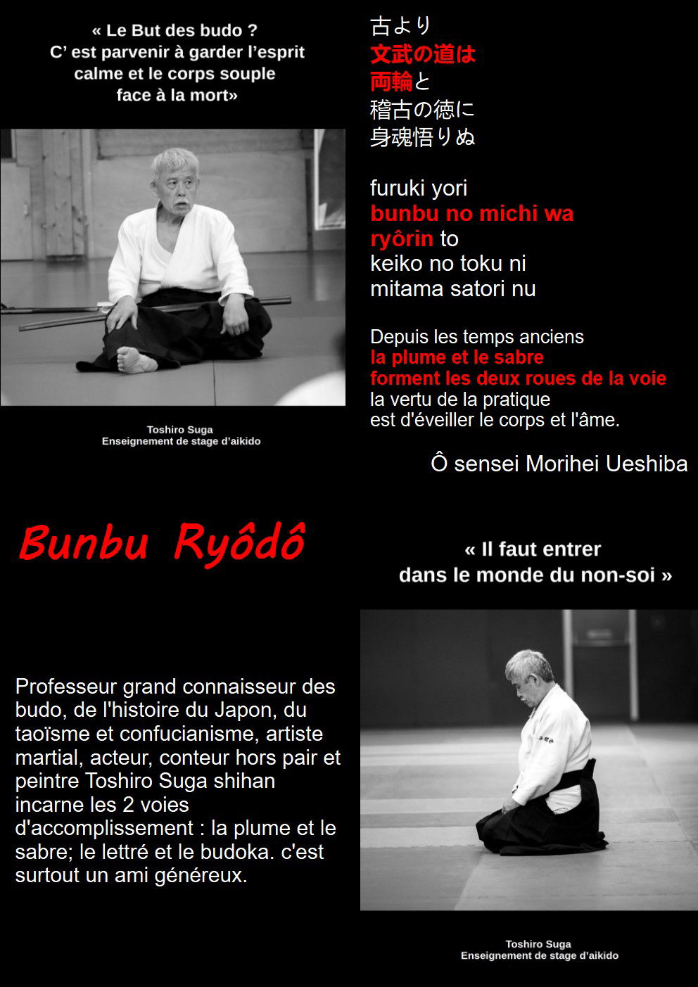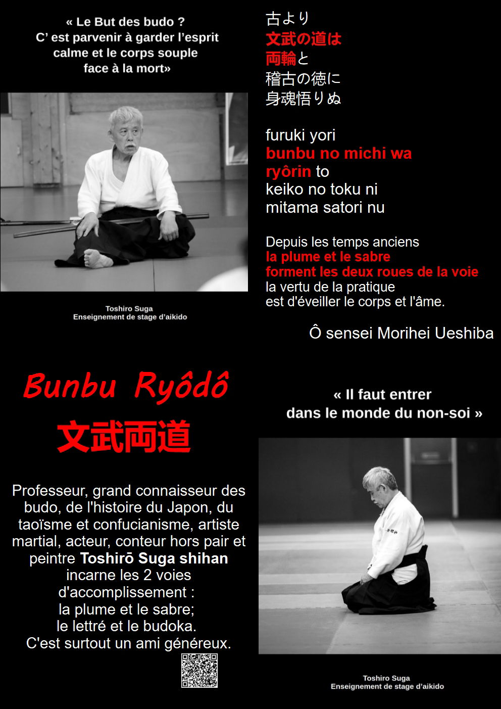 La combinaison de l'utilisation au Japon des 2 idéogrammes 文 & 武, remonte au 42ème empereur Momu Tenno 文武天皇 au 7ème siècle après JC, qui signifie que celui-ci était à la fois un stratège, un guerrier et un homme cultivé. Arts martiaux, poésie, théâtre, étude des kanji, histoire, sciences, stratégie... s'entremêlent dans cette série de stages et de documents, renouant ainsi avec cette notion qui fait des Budo les arts qu'ils sont devenus au cours des siècles. Un Samouraï sans éducation et armé pouvait plus facilement se transformer en une dangereuse brute que devenir un guerrier respectable. Nous ne sommes pas dupes et savons qu'un lettré peut, hier comme aujourd'hui, être ignoble. Cependant la culture et le retour sur soi sont un pas de plus vers la réalisation d'êtres humains nobles, libres. Nous vous invitons à suivre, certes modestement, les traces des plus illustres : Citons Miyamoto Musashi, Yagyû Munenori et au 20ème siècle Gishin Funakoshi ou Morihei Ueshiba ... et Toshiro SUGA